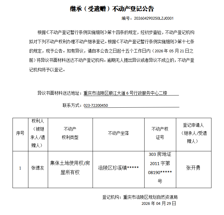 足球竞彩网 不动产继承公告202604290250LZJC001号