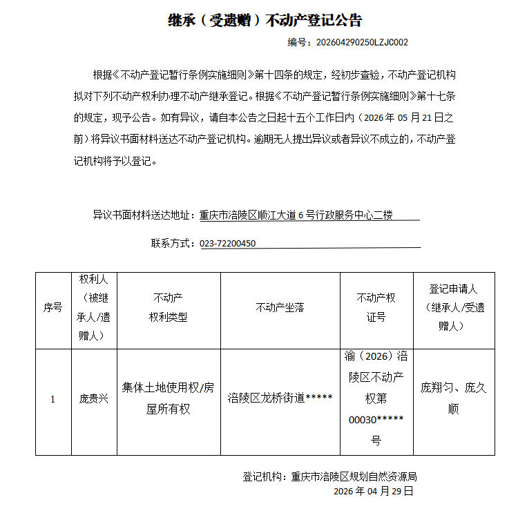 足球竞彩网 不动产继承公告202604290250LZJC002号