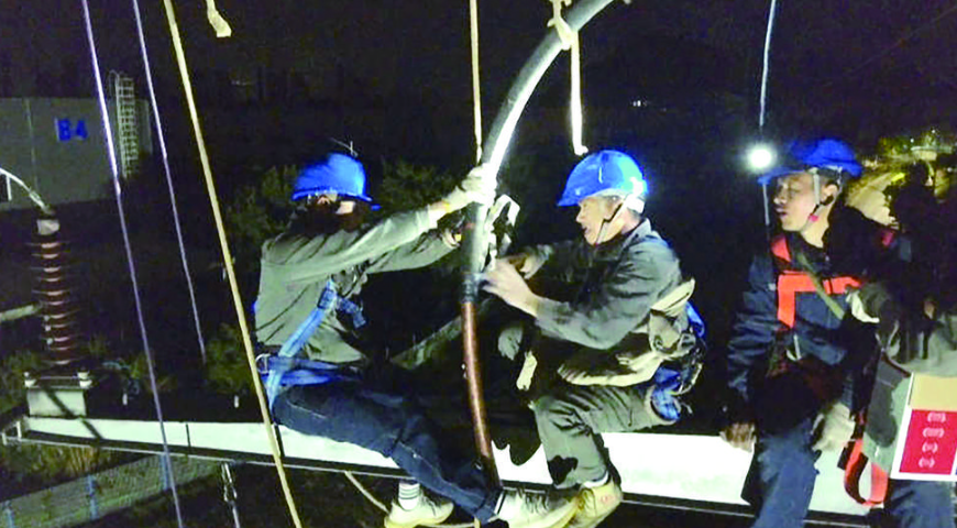 这是一场与时间赛跑的技术攻坚战。在狭窄的铁塔平台上,抢修队员顶着寒风,熟练地进行剥切、打磨、压接,探照灯下每一个动作都关乎成败。在密闭的厂区电缆沟内,他们蜷缩着身体,精准完成每一道工序,汗水与油污混在一起,眼神却始终专注。